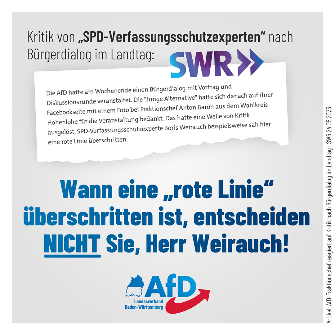 Am 24.5.2023 berichtete der SWR über die Teilnahme von Mitgliedern der AfD-Jugendorganisation Junge Alternative (JA) an einem offenen Bürgerdialog im Landtag – unter anderem (Zitat SWR): „(…) Die AfD hatte am Wochenende einen Bürgerdialog mit Vortrag und Diskussionsrunde veranstaltet. Die "Junge Alternative" hatte sich danach auf ihrer Facebookseite mit einem Foto bei Fraktionschef Anton Baron aus dem Wahlkreis Hohenlohe für die Veranstaltung bedankt. Das hatte eine Welle von Kritik ausgelöst. SPD-Verfassungsschutzexperte Boris Weirauch beispielsweise sah hier eine rote Linie überschritten. (…).“ Emil Sänze MdL. Co-Vorsitzender des AfD-Landesverbandes Baden-Württemberg ordnet den Vorgang ein: