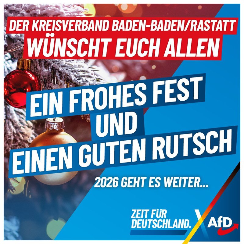 Der AfD-Kreisverband Baden-Baden/Rastatt wünscht Ihnen allen ein frohes Weihnachtsfest, besinnliche Feiertage sowie einen guten Rutsch und ein gesundes und erfolgreiches Neues Jahr! «Weihnachten ist die Zeit, die Welt für einen Moment langsamer werden zu lassen und sich auf das Wesentliche zu be...
