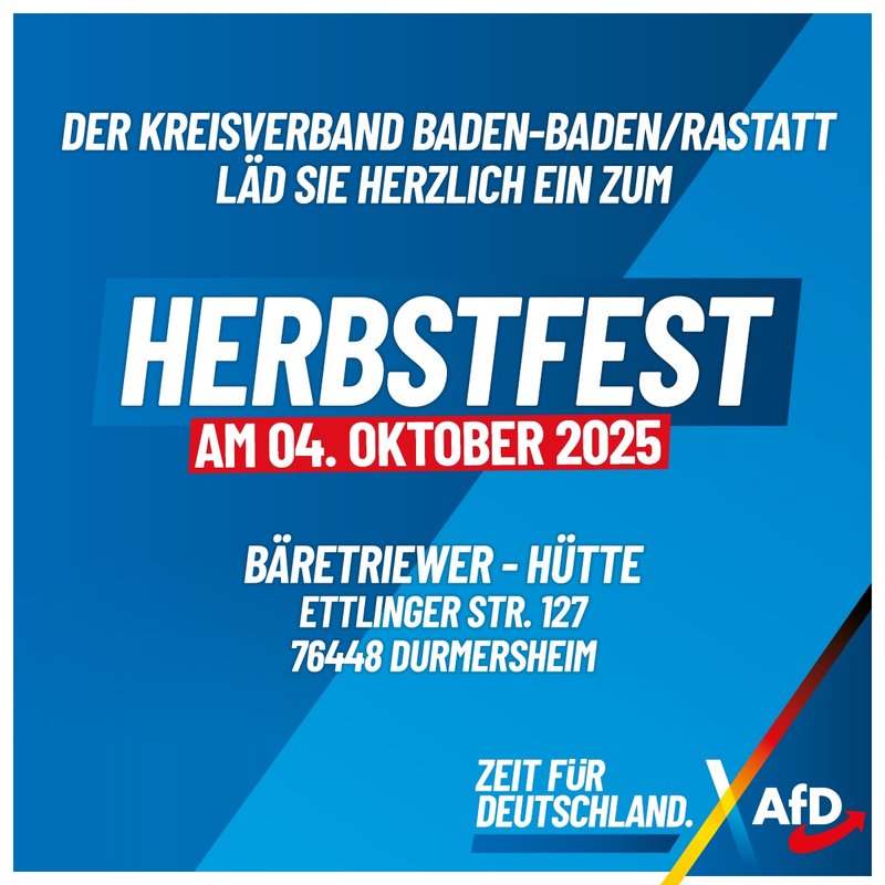 Wir laden Sie herzlich zum Herbstfest des AfD-Kreisverbands Baden-Baden/Rastatt, am 04. Oktober 2025 in der Bäretriewer-Hütte in Durmersheim ein. Beginn ist um 13:00 Uhr.