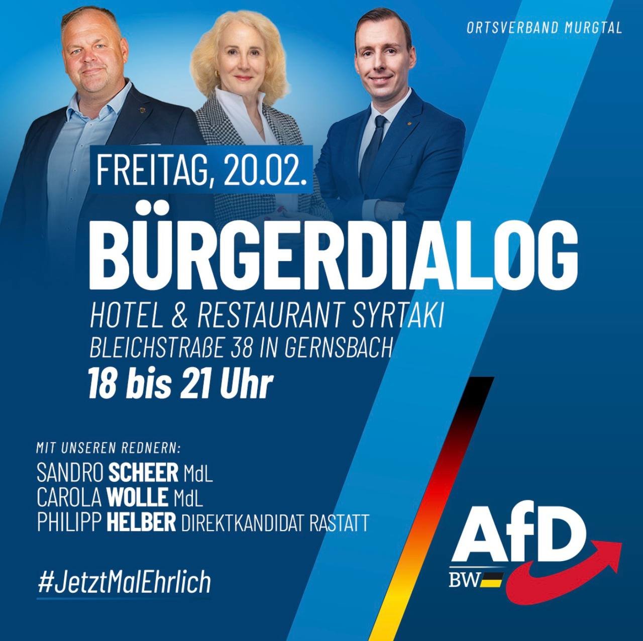 Einladung zum Bürgerdialog mit Sandro Scheer MdL, Carola Wolle MdL und Direktkandidat Philipp Helber am Freitag, den 20. Februar 2026, im Hotel & Restaurant Syrtaki in Gernsbach.