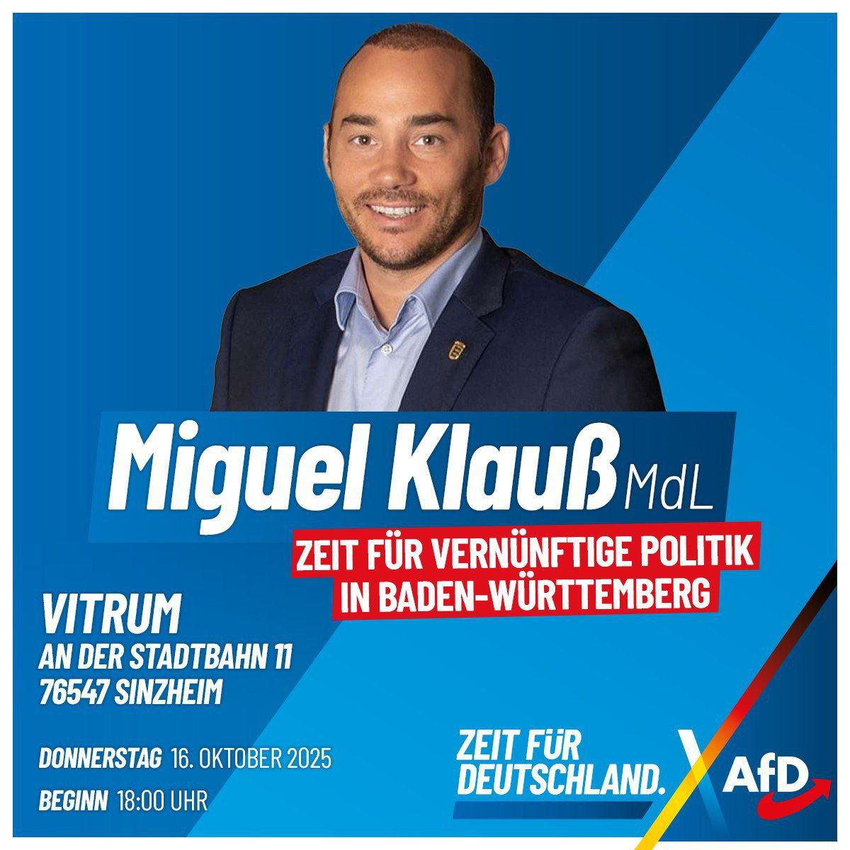 Der Stadtverband Baden-Baden der Alternative für Deutschland (AfD) lädt am Freitag, den 28. November 2025, um 18.00 Uhr alle interessierten Bürger zu seinem Monatstreffen in das Restaurant Vitrum in Sinzheim ein.