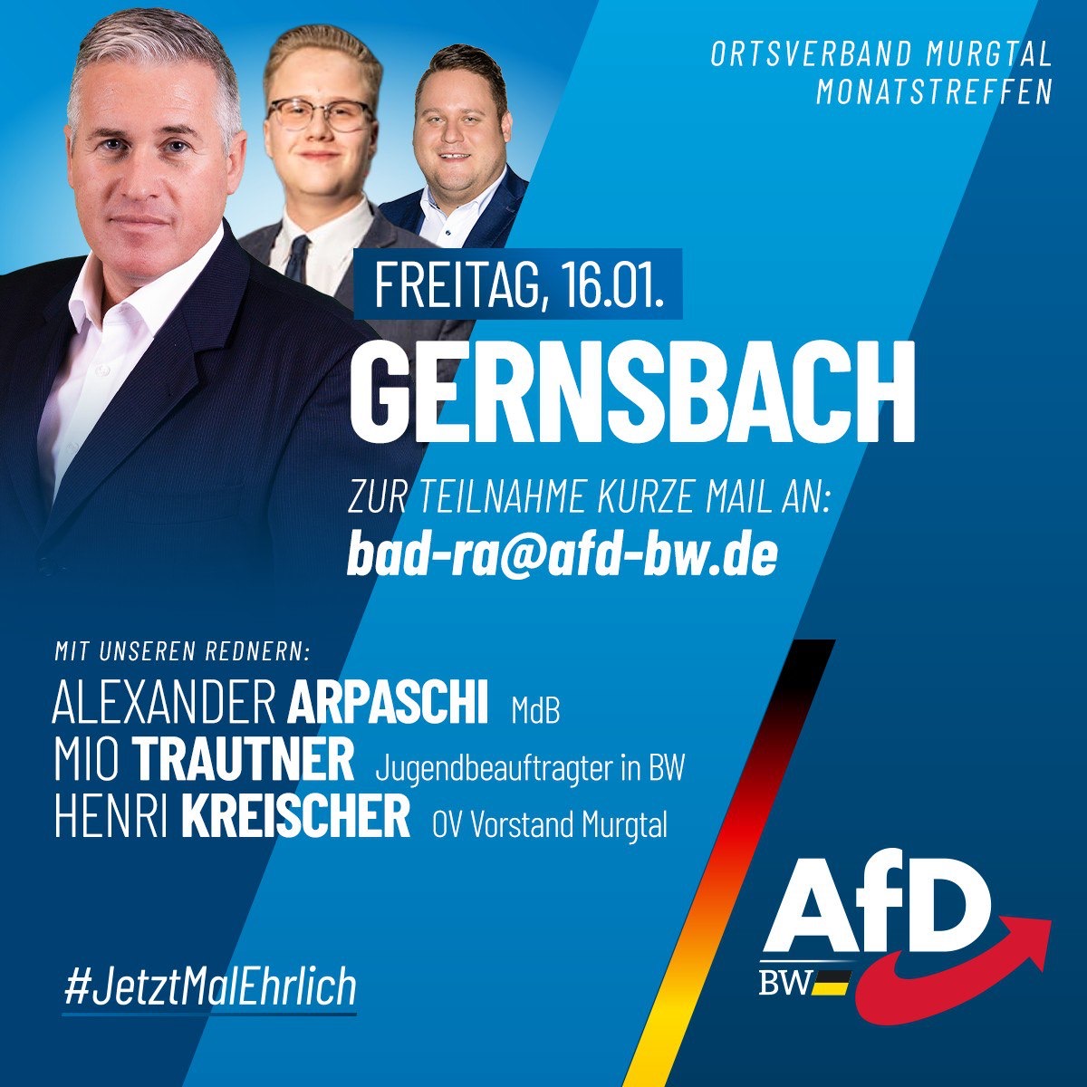 Am Freitag, den 16. Januar 2026 wird das erste Monatstreffen des Ortsverband Murgal in 2026 stattfinden. Der genaue Veranstaltungsort wird rechtzeitig bekanntgegeben. Es ist eine vorherige Anmeldung per E-Mail an bad-ra@afd-bw.de erforderlich.