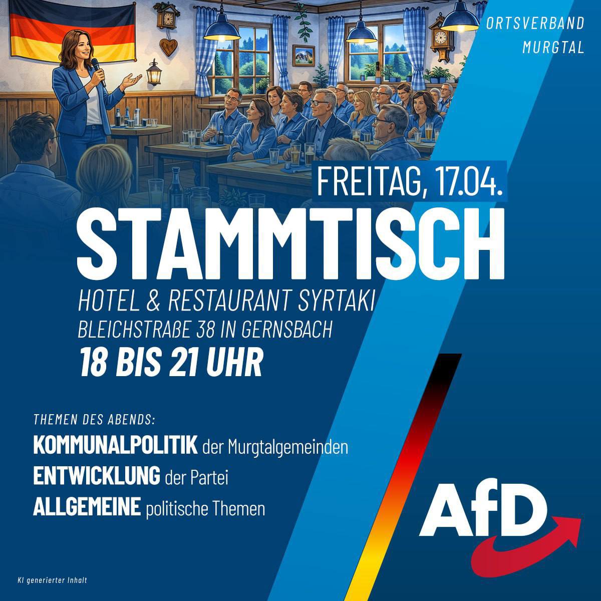 Am Freitag, den 17. April 2026 findet das nächste Monatstreffen des Ortsverband Murgal, im Hotel & Restaurant Syrtaki in Gernsbach statt. Themen des Abends werden Kommunalpolitik der Murgtalgemeinden, Entwicklung der Partei sowie allgemeine politische Themen sein.